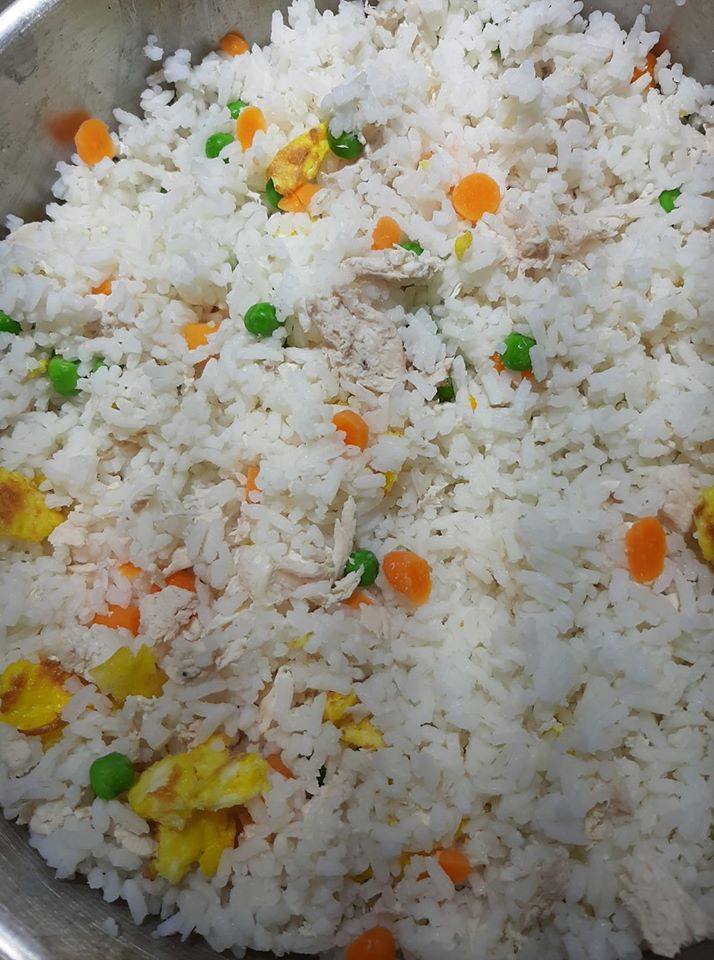 In case you are wondering what I make..it is really easy. I measure out six cups of water and equal parts rice (Makes twelve cups). I get out four eggs and I scrabble them plain, nothing added. I cut up one or two pieces of chicken breast and boil them for 15-20 minutes, until thoroughly cooked. I chop up about one cup of carrots and cook them in a pot to make them soft. I take about one cup of green peas. When the chicken is cooked most else will be as well. And I mix it all in. I use my big saucepan.