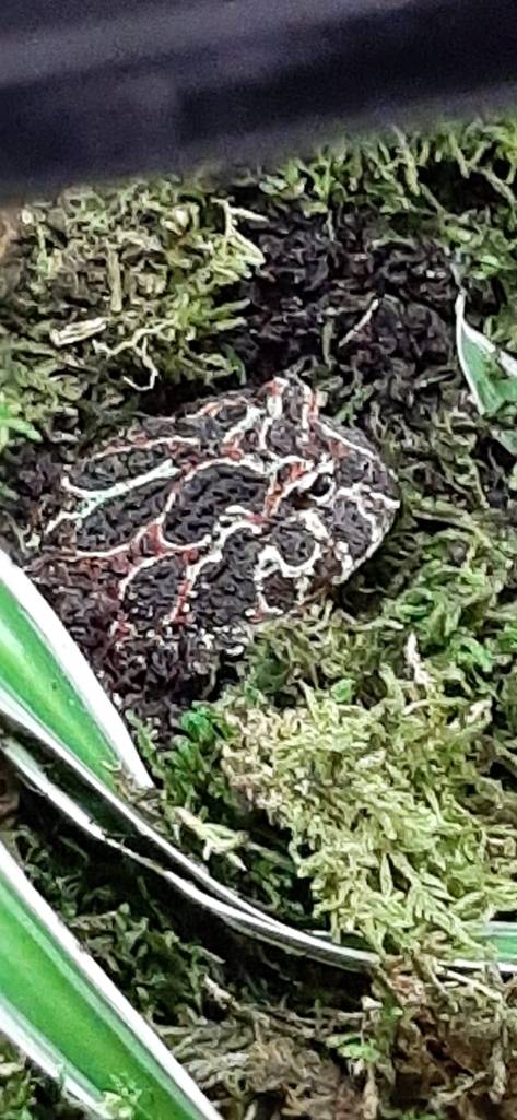 I decided to name him Ranger. He has been hiding all day. He is a Fantasy Horned Frog. A hybrid of two species.